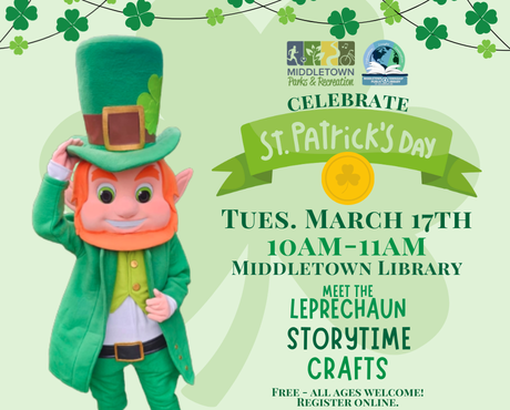 Join us for a special story time at the Library for St. Patrick's Day. Enjoy crafts and photos with the Leprechaun after.